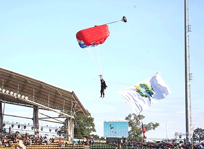 Army personnel add to the drama by parachuting into the National Stadium. |