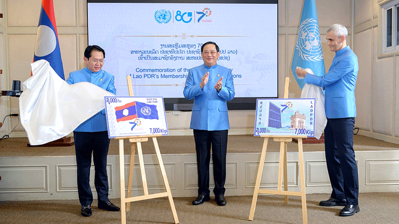 | Dr Sonexay Siphandone (centre), Mr Anouparb Vongnorkeo (left), and Mr Bakhodir Burkhanov unveil commemorative stamps marking 70 years of Laos’ membership in the United Nations. |
