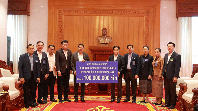 Secretary of the Bolikhamxay province Party Committee, Mr Sonthanou Thammavong (fifth right), and his officials on Wednesday give 100 million kip to the Secretary of the Vientiane Party Committee, Dr Athsaphangthong Siphandone (fifth left), and his officials to assist people in Sikhottabong district whose houses were damaged by a freak hailstorm on Sunday. On the same day, representatives of five provinces donated funds for relief aid in the wake of natural disasters. |