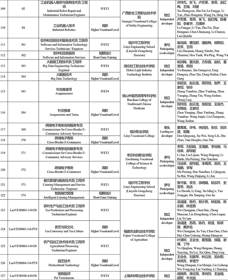 The standards released in this phase span multiple fields, including horticultural technology, animal disease control, mechanical engineering technology, mechatronics, new energy vehicles, industrial robotics, IoT applications, nursing, traditional Chinese pharmacology, rehabilitation therapy, cross-border e-commerce, and more. They cover IVET1 to IVET4 levels, higher vocational education, and short-term training programmes.