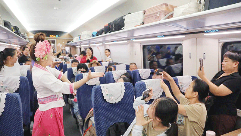 Stewardesses interact with passengers aboard train No. D86 from Kunming, capital city of southwest China’s Yunnan Province, to the Lao capital Vientiane, July 18, 2025. --Photo Xinhua