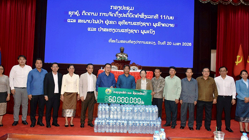 Minister of Agriculture and Environment, Dr Linkham Douangsavanh, and his officials on Monday give 60 million kip and drinking water to representatives of Vientiane and the provinces of Vientiane, Xaysomboun and Bolikhamxay to support personnel working to extinguish fires in the Phou Khao Khuay and Phou Phanang National Protected Areas. --Photo Pasaxon |