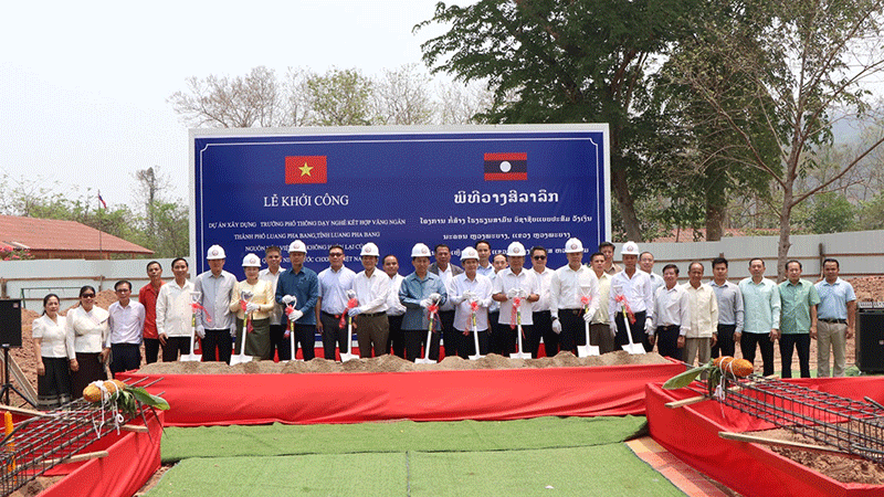 Members of the Luang Prabang Provincial People’s Council, officials from the provincial Education and Sports Department, representatives of the Vietnamese Consul General in northern Laos and other individuals on Monday share in a groundbreaking ceremony to kick off construction of Vangngeun Vocational Normal School. The construction cost of 50 billion dong is funded by Quang Ninh province in Vietnam. The school is scheduled for completion in March 2028. --Photo Pathetlao |