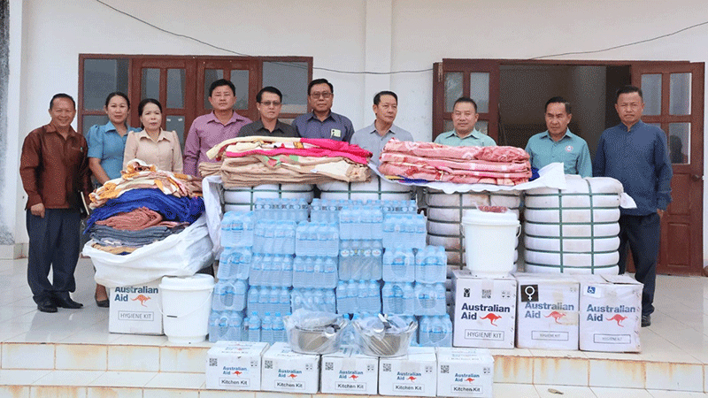 Secretary of the Xaysomboun Provincial Party Committee, Mr Phoykham Houngbounnhuang, and his colleagues on Monday deliver blankets, drinking water and other supplies to Longxan district authorities for distribution to 72 families who suffered losses during a storm that lashed the area on April 18. --Photo Vientiane Mai |