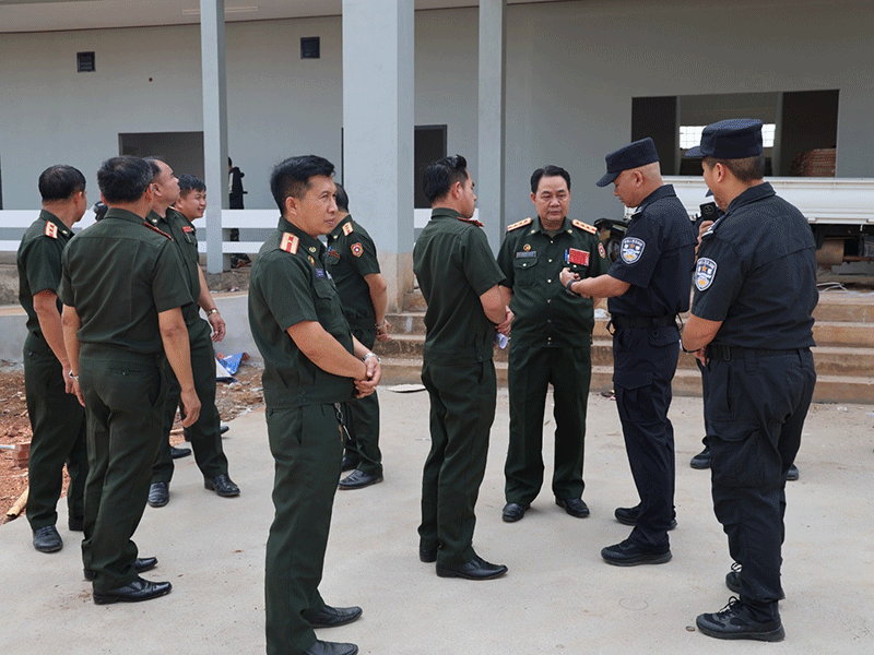 Military personnel in Bokeo province and members of a river patrol from Yunnan province in China on Tuesday inspect the progress of construction of a logistics and technical office for the Bokeo Military Command, which is currently 70 percent complete. --Photo Lao People’s Army News |