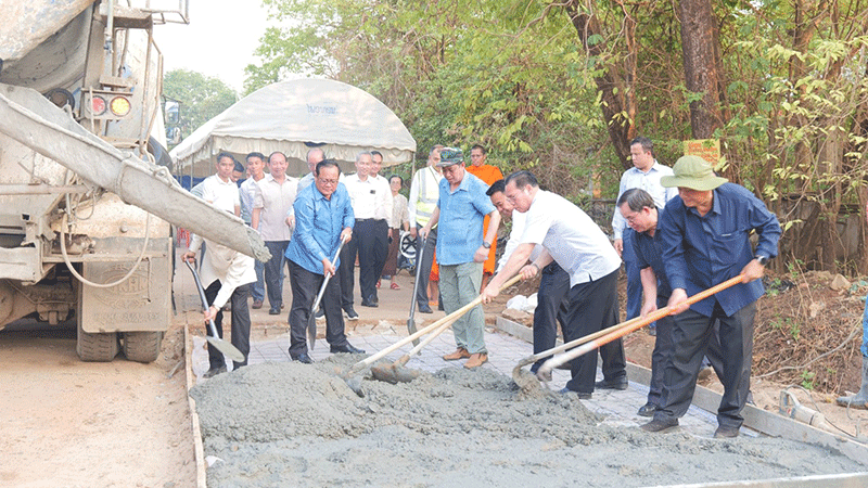 Secretary of the Champasak Provincial Party Committee, Mr Alounxay Sounnalath, senior provincial officials and other individuals on Tuesday assist with the laying of concrete on a 1,493-metre road in Xok-amnuay village, Pakse city. The cost of construction is about 500 million kip, funded by the government and the public. --Photo Champamai Newspaper |
