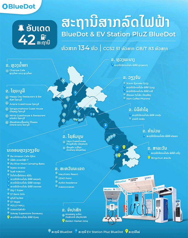 At present, BlueDot operates more than 40 charging stations with over 120 plugs across Laos, with plans to expand further to ensure nationwide coverage.