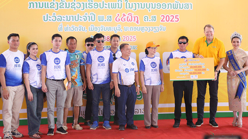 Representatives of Lao Brewery Co., Ltd. present a cash prize to the winning Joint Development Bank’s men’s team after they won the traditional boat race contest in Vientiane on Wednesday. |