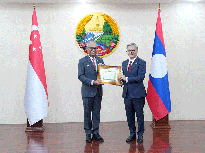 Minister of Foreign Affairs Mr Thongsavanh Phomvihane (right) on Thursday presents a Friendship Medal to the Ambassador of Singapore to Laos, Mr Sudesh Maniar, at the end of his mission in Laos. The medal was awarded in recognition of the ambassador’s efforts to enhance friendship and cooperation between Laos and Singapore, leading to tangible results. --Photo Ministry of Foreign Affairs |