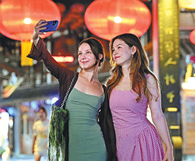 Travelers from Russia pose for photographs at a tourist attraction in Chongqing. |
