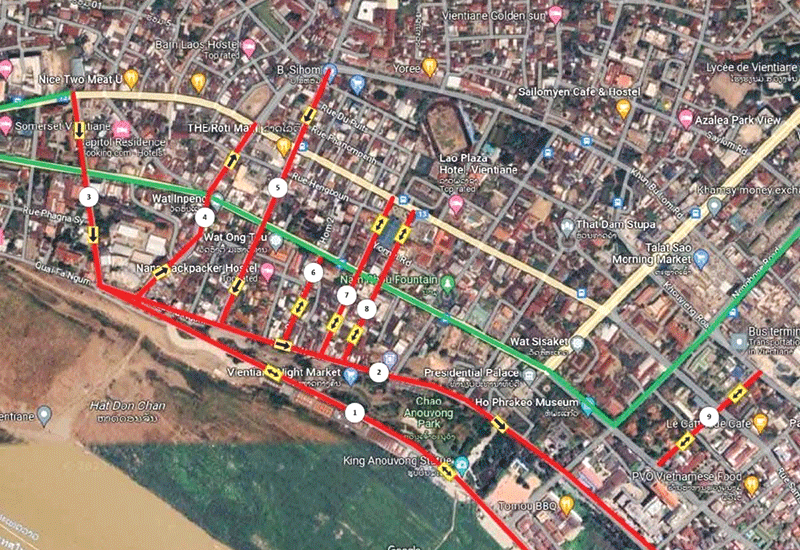Chao Fa Ngum Road (inbound) will be one-way; Sithan Road will be one-way (downward/exit); Khounboulom Road will be one-way (upward/entry); Rue Françoise d’Aubigné will be two-way; Nokeokoummane Road will be two-way; Manthatourath Road will be two-way; and the road in front of the French Embassy will be two-way.