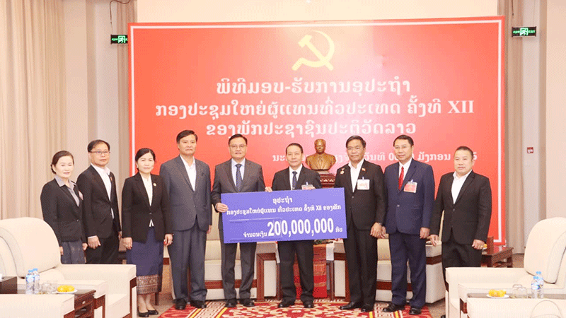 The Party Secretary of Xaysomboun province, Mr Phoykham Houngbounyuang (fourth right), and his officials on Monday present 200 million kip to Minister of Finance Mr Santiphab Phomvihane (fifth left) and his officials to help cover the cost of the 12th National Party Congress. --Photo Pathetlao |