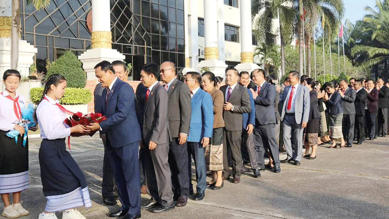 The government, represented by Minister of Finance Mr Santiphab Phomvihane (fifth left) and his associates, on Monday receives 310 million kip from executives at the Banque pour le Commerce Extérieur Lao (BCEL) to support the 12th National Party Congress. --Photo Pathetlao |