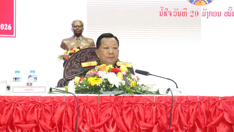 Deputy Prime Minister General Chansamone Chanyalath on Wednesday delivers an address at a meeting to mark the 77th anniversary of the Lao People’s Army. The meeting was organised by the Ministry of National Defence and attended by senior officials from the ministry and related sectors. --Photo Pasaxon |