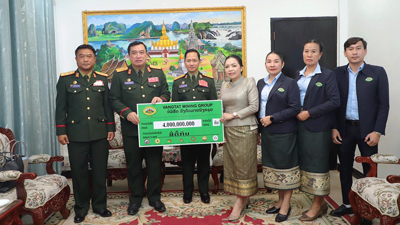 Representatives of the Vangtat Mining Group on Monday give 4 billion kip to the Ministry of National Defence to mark the 77th anniversary of Lao Army Day on January 20, witnessed by the Minister of National Defence, Lieutenant General Khamlieng Outhakaysone, and other officials from the two sides. --Photo Lao People's Army News |
