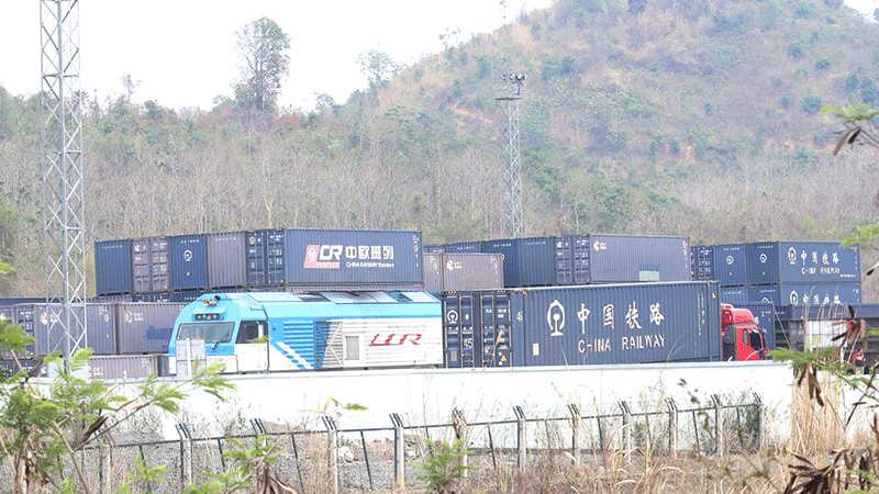 | Containers carrying goods for export and import sit at a freight yard on the Laos-China Railway. |