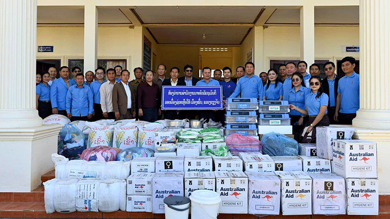 Representatives of three divisions of the Prime Minister’s Office on Friday deliver supplies to families in Meun and Meuangfeuang districts in Vientiane province who are still recovering from losses suffered during severe flooding last year. The supplies comprised one ton of rice, eggs, 50 sheets, 20 hygiene kits, clothes, mosquito nets and other items. --Photo Lao National Radio |