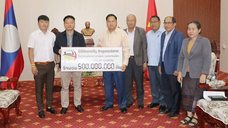 Representatives of the Vangtat Mining Group and Dakcheung Mineral Exploration Co., Ltd. last week give 500 million kip to Xekong officials to assist with administrative costs involved in the election of new members of the National Assembly and Xekong Provincial People’s Council next month. --Photo Pasaxon |