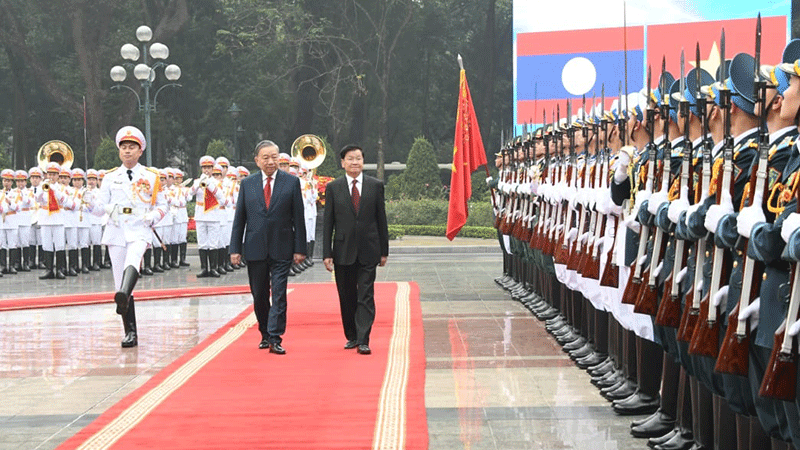 | General Secretary of the Communist Party of Vietnam, To Lam (left), on Monday escorts LPRP Secretary General and President of Laos, Thongloun Sisoulith, to inspect a guard of honour during his two-day state visit to Vietnam from January 26-27. |