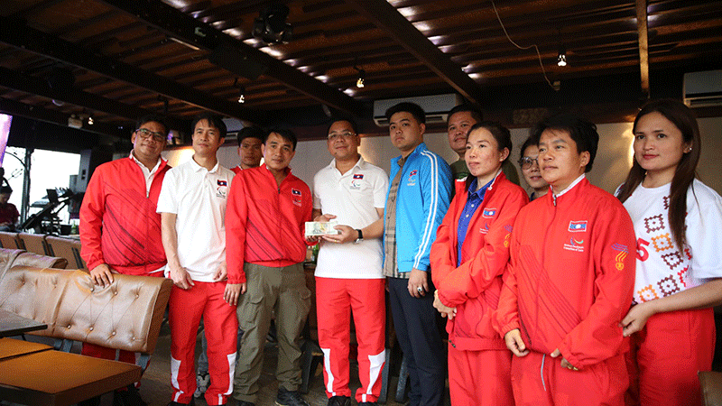 President of the Lao Disabled Shooting Federation, Mr Sitpakone Phommavongsa, and his officials on Tuesday, present an award to Xaysavanh Mahaxay, who won a gold medal at the ASEAN Para Games in the men’s 50-metre shooting event. |