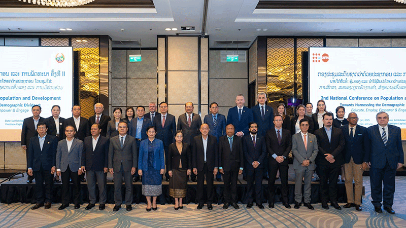 The Deputy Prime Minister, Prof. Dr Kikeo Khaykhamphithoune, the United Nations Population Fund’s Regional Director for Asia and the Pacific, Mr Pio Smith, and senior government officials, representatives of development partners, and delegates from Cambodia and Vietnam pose for a group photo at the 2nd National Conference on Population and Development in Vientiane on October 1. The meeting focused on harnessing Laos’ demographic dividend by empowering young people through education, employment and healthcare, while linking the Demographic Dividend Roadmap with the 10th National Socio-Economic Development Plan for 2026–2030. |