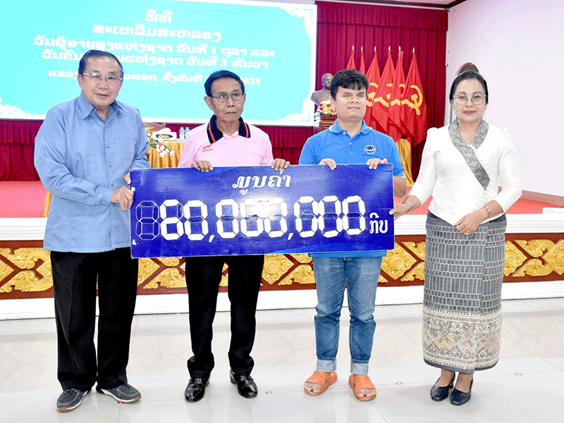 Representatives of Savannakhet province on Wednesday provide 60 million kip to provincial associations that support people with visual impairments and other physical disabilities, to mark the Day of Elderly and Disabled Persons. --Photo Pasaxon |