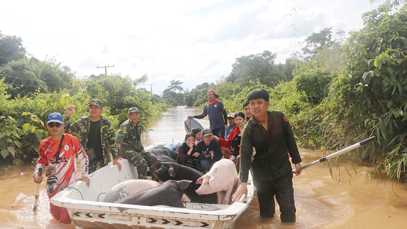 Soldiers and local residents on Wednesday move animals to safety in Phonhong district, Vientiane province, after heavy rain caused rivers to overflow their banks and cause flooding in the area.