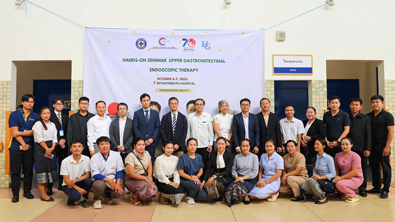 Setthathirath Hospital hosts a meeting and practical training session on advanced techniques for upper gastrointestinal endoscopy to raise the standard of gastric cancer screening. The event was supported by the Japanese non-profit organisation NPO-HIGAN. The session was chaired by the Director of Setthathirath Hospital, Dr Vangnakone Dittaphong, an expert from Osaka International, Prof. Dr Noriya Uedo, the Cancer Institute, and a specialist from Japan’s Fukuoka University, Chikushi Hospital, Assoc. Prof. Dr Kentaro Imamura. |