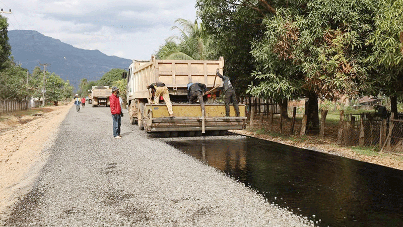 Asphalt is laid on a 7-km section of Road No. 9039 in Layao village, Samakkhixay district, Attapeu province, with the work now 75 percent complete. It is expected that the first of two layers of asphalt will be laid by the end of this year. --Photo Pasaxon |