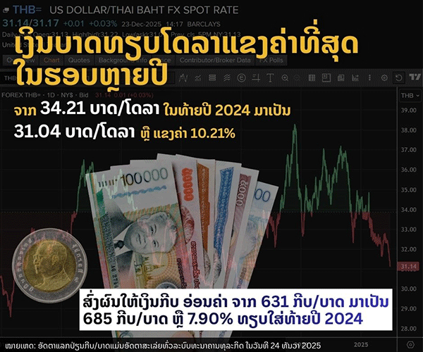 The exchange rate between the two currencies shifted from 631 LAK per THB at the end of 2024 to around 685 LAK per THB, reflecting a depreciation rate of 7.9 percent.