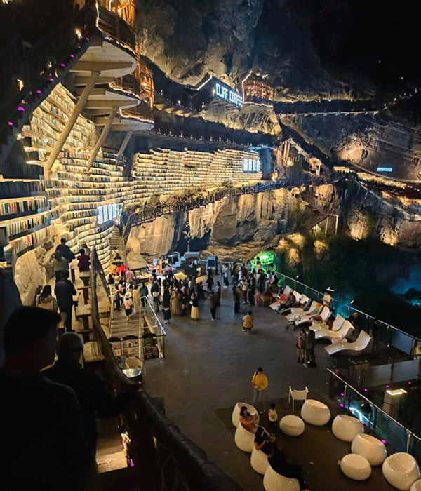 Instead of reshaping the landscape, development here has worked with it. Cliffside hotels cling to rock walls, glass walkways reveal dizzying depths, and a mid-air bookstore invites visitors to pause and read above the abyss. Adventure and reflection coexist in equal measure.