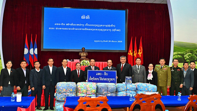 Deputy Prime Minister Prof. Dr Kikeo Khaykhamphithoune and his officials on Monday deliver clothing to Xiengkhouang province authorities for distribution to impoverished families in remote areas. --Photo Lao National Radio |
