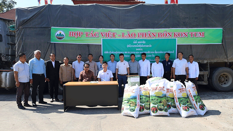 Representatives of a partner company from Vietnam on Tuesday give 25 tonnes of bio-fertiliser worth 55 million kip to officials from Attapeu province’s Agriculture and Environment Department for use in crop cultivation. The company is also providing training in the use of organic biofertiliser for selected families in Attapeu province. --Photo Thitpasong |