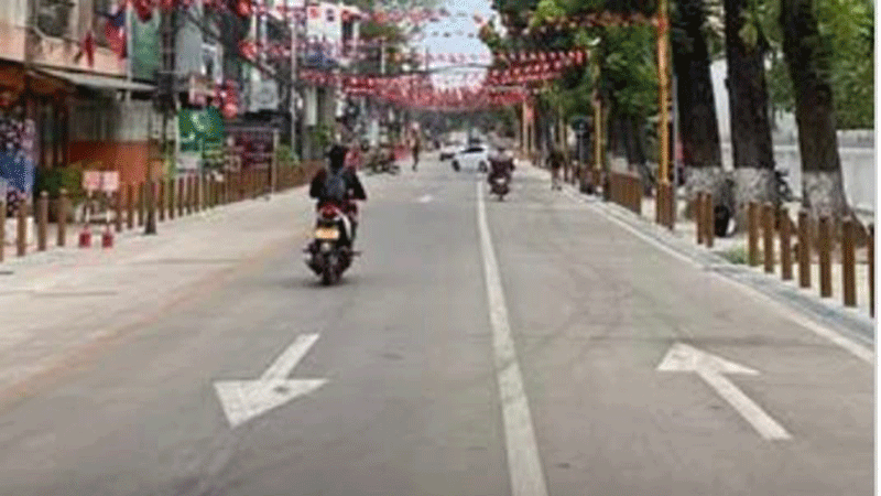 | This road near Ongtue temple in Vientiane will soon change from one-way to two-way, as indicated by the arrows. |