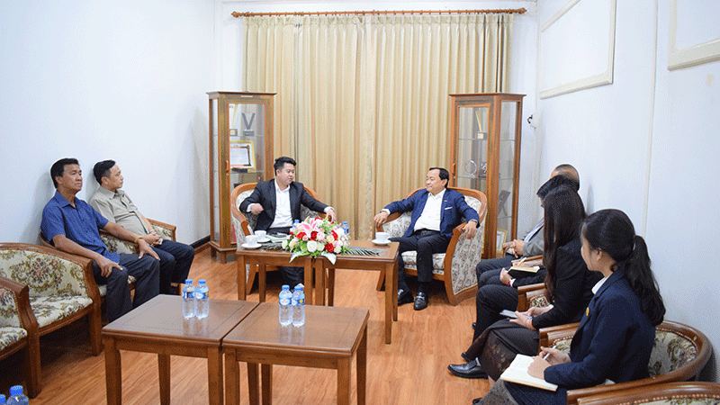 The Executive Vice President of the Lao National Chamber of Commerce and Industry, Mr Daovone Phachanthavong (right), and other senior LNCCI officials welcome the Managing Director of Lao NewPay Technology Joint Venture Co., Ltd., Dr Meksavang Phommaly (left), at the LNCCI office.