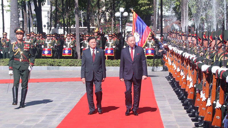 Party Secretary General and President of Laos, Thoungloun Sisoulith (left), and General Secretary of the Central Committee of the Communist Party of Vietnam, To Lam, inspect a guard of honour during a ceremony at the Presidential Office to welcome the Vietnamese leader. –Photo Pasaxon