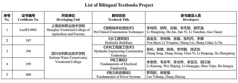 The bilingual textbooks issued during this phase focus on areas such as pet clinical examination techniques, hydraulic structures, hydraulic engineering construction technology, fundamentals of electrical engineering, and fundamentals of power systems.
