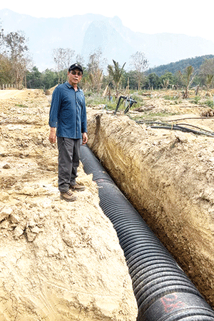 He uses high-grade products from Toyo Industry Lao Factory Sole Company Limited. These Lao-made pipes were chosen for their durability and the speed with which they can be installed in challenging, vertical terrain.