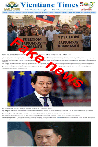The fabricated content falsely claims that the Vientiane Times reported on a public protest and includes an altered image marked “FAKE NEWS”, along with invented text and transcripts. We confirm that no such article, headline or report has ever appeared on our website, printed newspaper or official platforms.