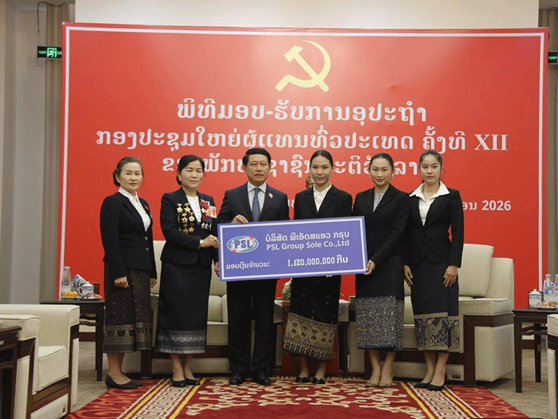 Deputy Prime Minister Saleumxay Kommasith (third left) and his associates receive more than 1 billion kip from representatives of PSL Group Sole Co., Ltd. to help finance the National Party Congress. --Photo Lao National Radio |