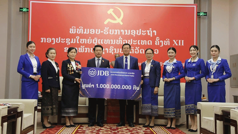 | Deputy Prime Minister Saleumxay Kommasith (fourth left) and his associates receive 1 billion kip from representatives of the Joint Development Bank Public as a contribution to the National Party Congress. --Photo Lao National Radio |