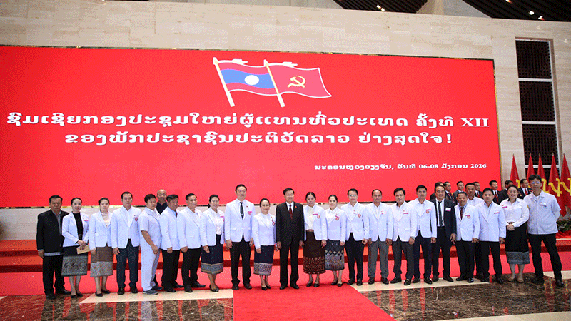 Party Secretary General Thongloun Sisoulith stands with health ministry officials on the last day of the National Party Congress. |