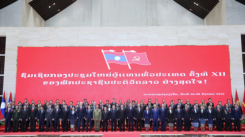 Newly elected members of the 12th Central Committee of the Lao People’s Revolutionary Party pose for a group photo on Thursday following their election at the 12th National Party Congress. |
