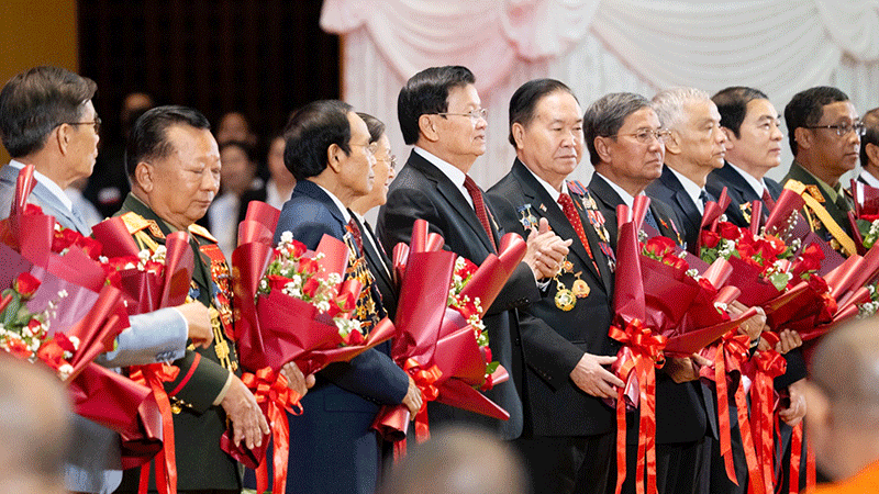 Party Secretary General Thongloun Sisoulith stands with former members of the Party Central Committee after their valuable service was acknowledged. |