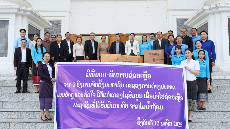 The Deputy Minister of Foreign Affairs, Ms Phongsamouth Anlavan, and officials of three mass organisations of the Ministry last week delivered 300 million kip, more than 900 kg of rice, 20 boxes of clothing and other items to the Governor of Xaysomboun province, Mr Phoykham Houngbounyuang, to help people affected by floods at the end of 2024 and September this year. --Photo MOFA |