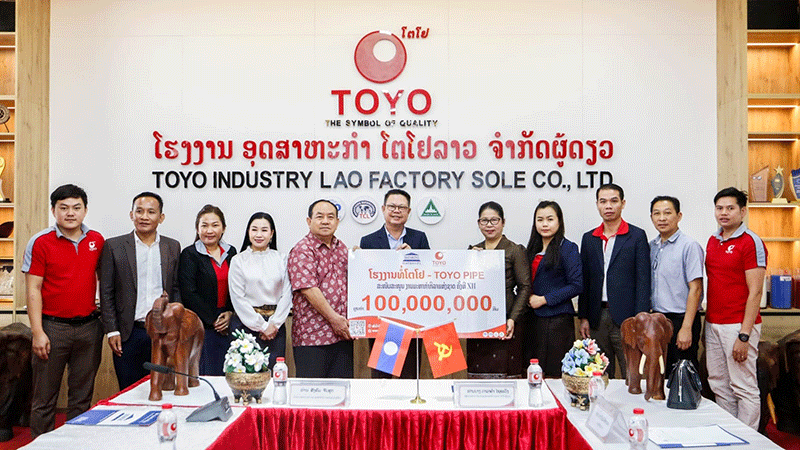 A representative of the Toyo Industry Lao Factory Sole Co Ltd (right) last week presented 100 million kip to a representative of Vientiane’s Chamber of Commerce and Industry (left) to support the 12th National Games being hosted by Vientiane during November 15-25 and for the development of Lao sports. |