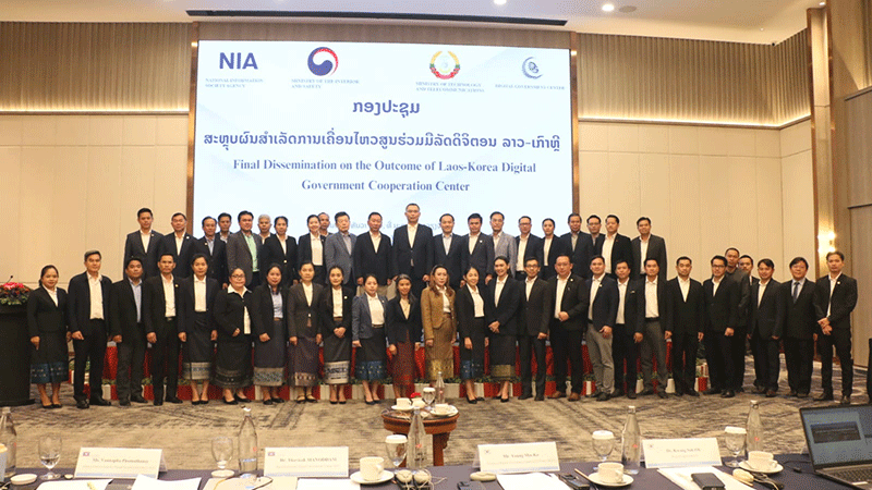 Officials from the Ministry of the Interior and Safety of the Republic of Korea, the Lao National Information Society Agency, and the Digital Government Cooperation Centre, senior ministry officials and invited guests gather with Deputy Minister of Technology and Communications, Mr Keovisouk Solaphom (front, centre), and Director General of the Digital Government Centre, Dr Thavisak Manodham, at a conference to summarise the successful implementation of the Digital Government Cooperation Centre project between Laos and the Republic of Korea. The project, which took place under the Lao-Korea Digital Government Cooperation Framework for 2023-2025, drafted a 10-year digital government service development plan and formulated recommendations to improve the Digital Government Development Index. |