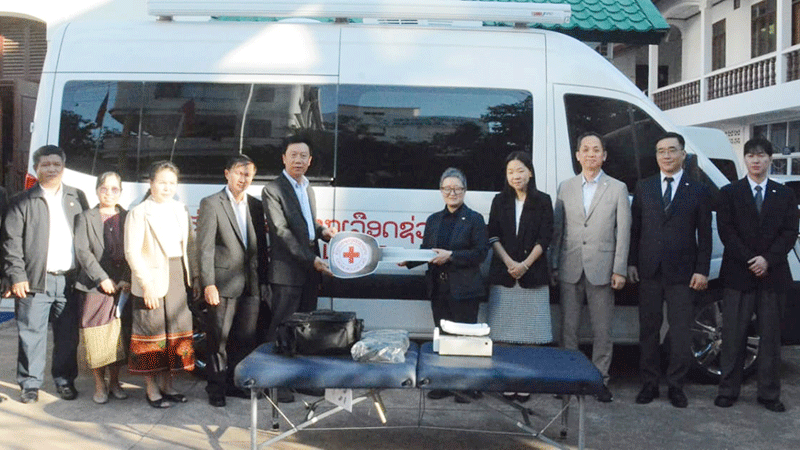 A delegation from Korean Red Cross Blood Services (KRCBS), led by their Director General, Dr Kwon So-Yong, on Tuesday stands with staff from the Lao National Blood Transfusion Institute and the President of the Lao Red Cross, Mr Khamlavanh Chanthalavanh, for the handover of a mobile blood donation vehicle and blood collection equipment to the Lao Red Cross. The items were donated by the Korean agency under a programme to “Scale Up the Capacity of the LRC National Blood Transfusion Institute in Increasing Blood Collections”, which is taking place from May 2025 to April 2026. |
