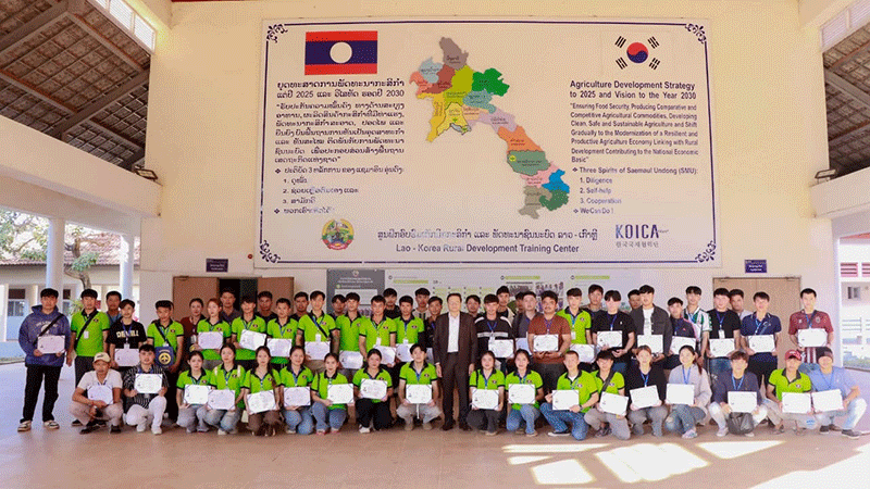 Sixty-one trainees from the Sonphasak Employment Service Company display their certificates alongside officials from the Laos-Korea Rural Development and Training Centre following an agricultural technical training programme last week designed to modernise farming practices. The session covered soil preparation, irrigation management, crop protection, and livestock and aquaculture techniques. The programme also emphasised post-harvest technology to ensure food quality and reduce waste. An official at the Training Centre encouraged the group to actively apply their new skills to drive growth in their respective areas of work. |