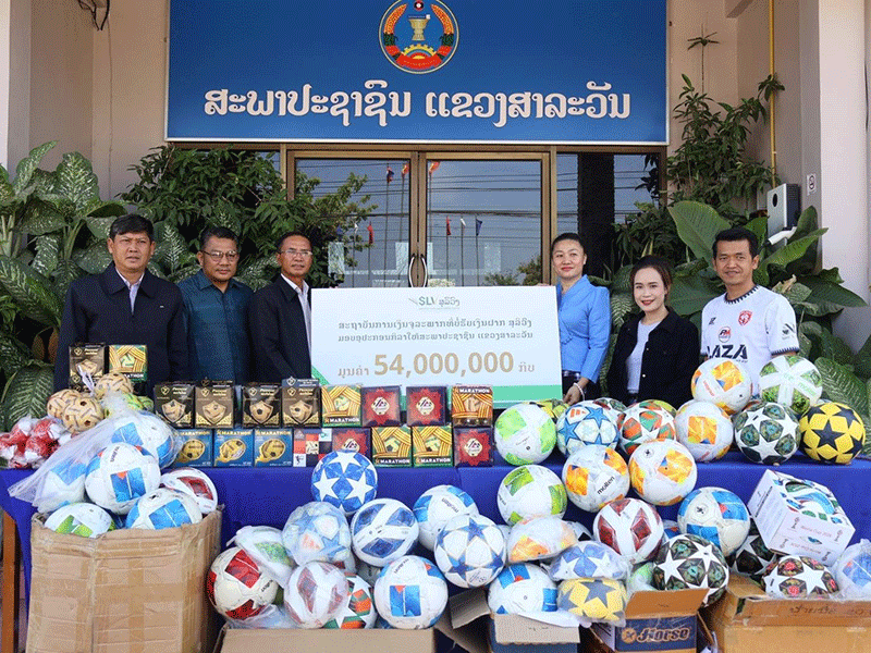 Representatives of the Soulivong Microfinance Institution (right) on Wednesday donate sports equipment worth 54 million kip to members of the Salavan Provincial People's Council. --Photo Pasaxon |